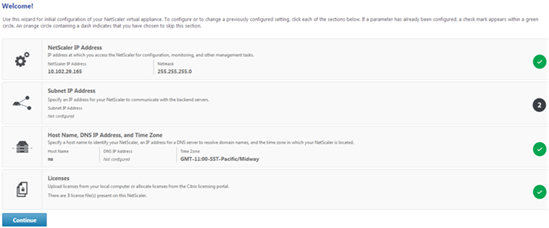 Assign a NetScaler IP (NSIP) address as the management IP address of your NetScaler appliance. You access the appliance for configuration, monitoring, and other management tasks at this address. Assign a subnet IP (SNIP) address for your NetScaler to communicate with the back-end servers. Specify a host name to identify your appliance, an IP address for a DNS server to resolve domain names, and the time zone in which your appliance is located.