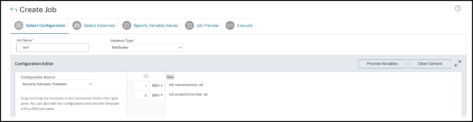 For a NetScaler instance impacted by multiple CVEs (such as CVE-2020-8300, CVE-2021-22927, CVE-2021-22920, CVE-2021-22956, and CVE-2025-5777): when you select the instance and click Proceed to configuration job workflow, the built-in configuration template does not auto-populate under Select configuration. You must Drag and drop the appropriate config job template under Security Advisory Template manually to the config job pane on the right side.